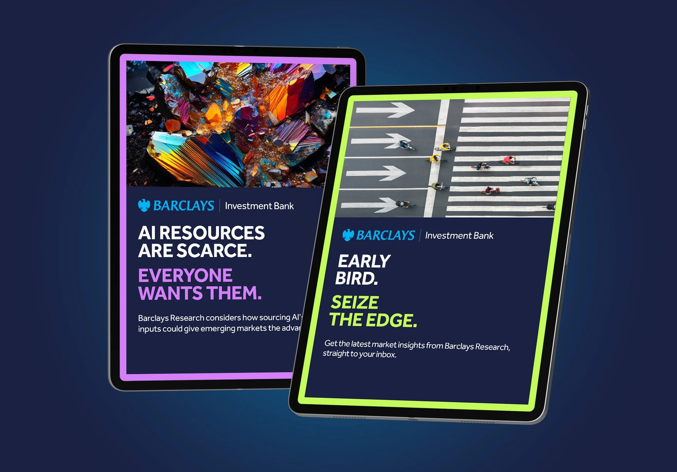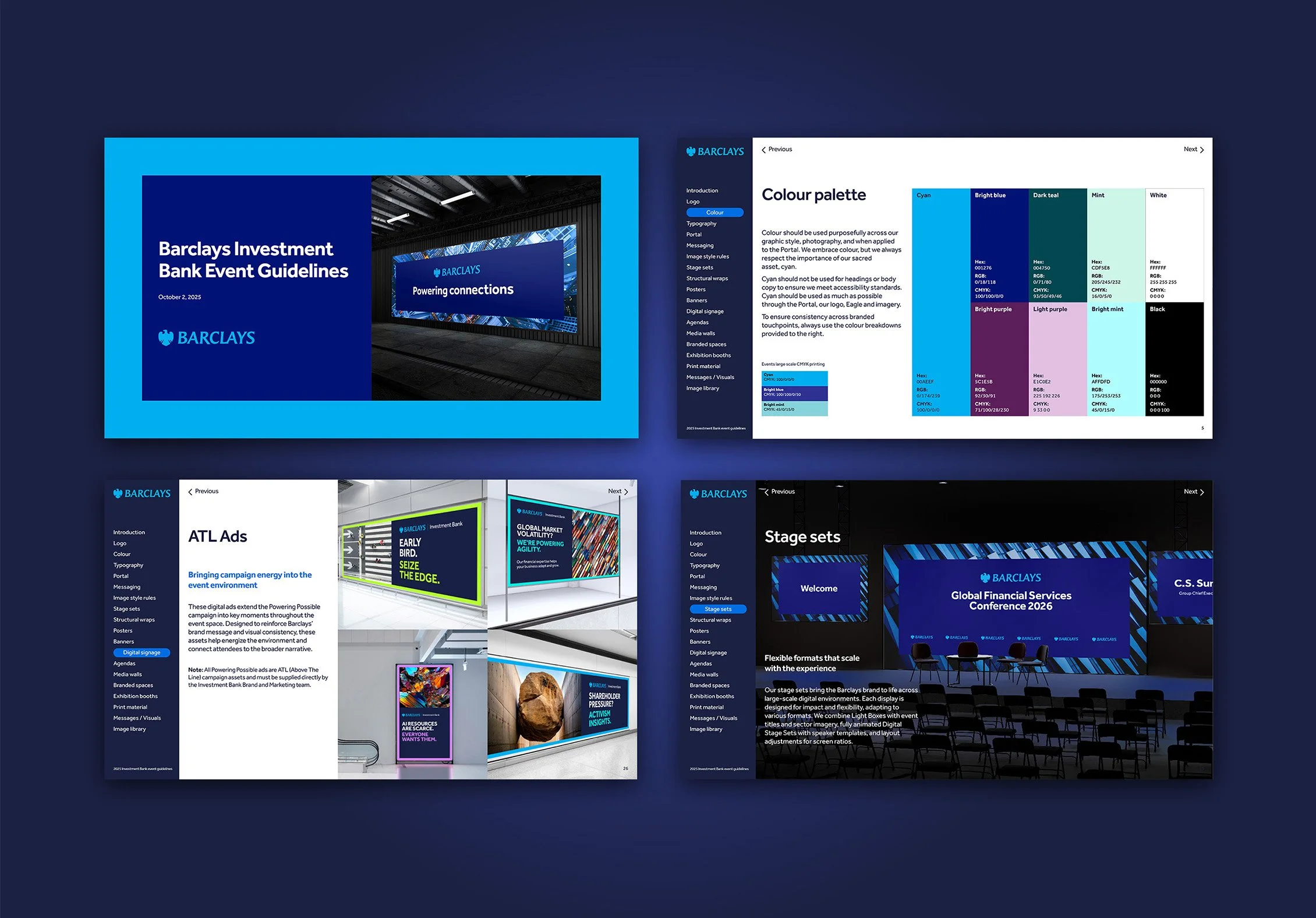 The team at Living Group introduced a two-beat messaging strategy: first highlight real-world client challenges; then show how Barclays delivers the insight and solutions to power ambition. A refined visual system—type, graphics, color and imagery—is captured it in comprehensive campaign and event guidelines.